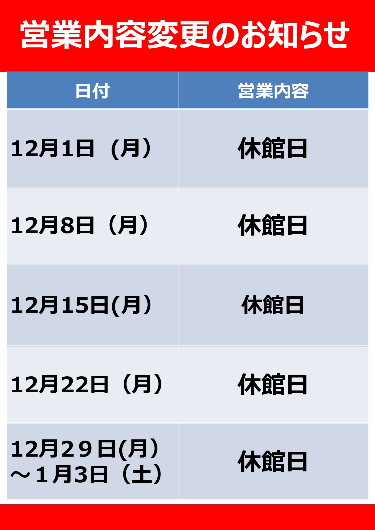 年末年始に伴う施設休館日変更等のため、一部営業内容を変更いたします。