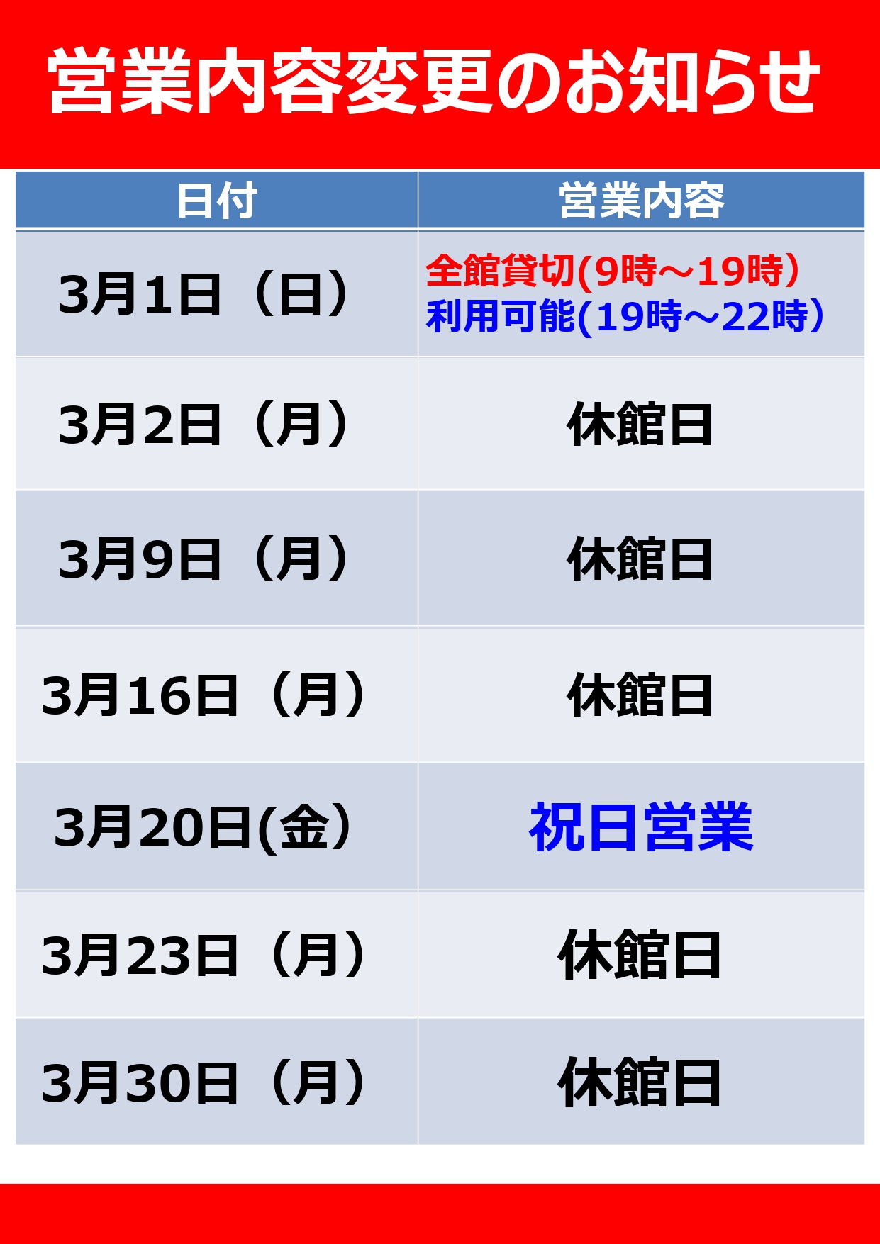 全館貸切や月曜祝日営業に伴う施設休館日変更等のため、一部営業内容を変更いたします。
