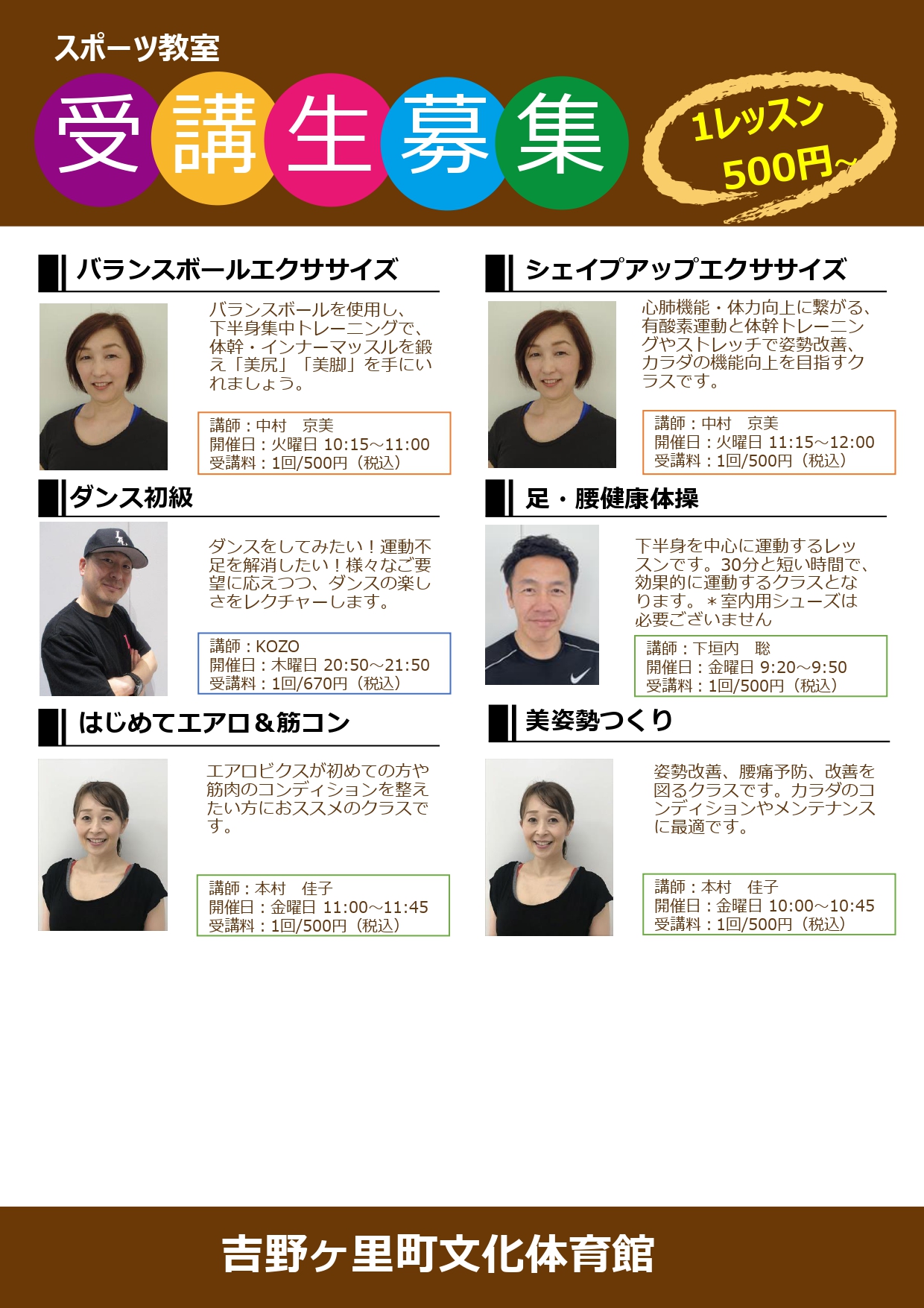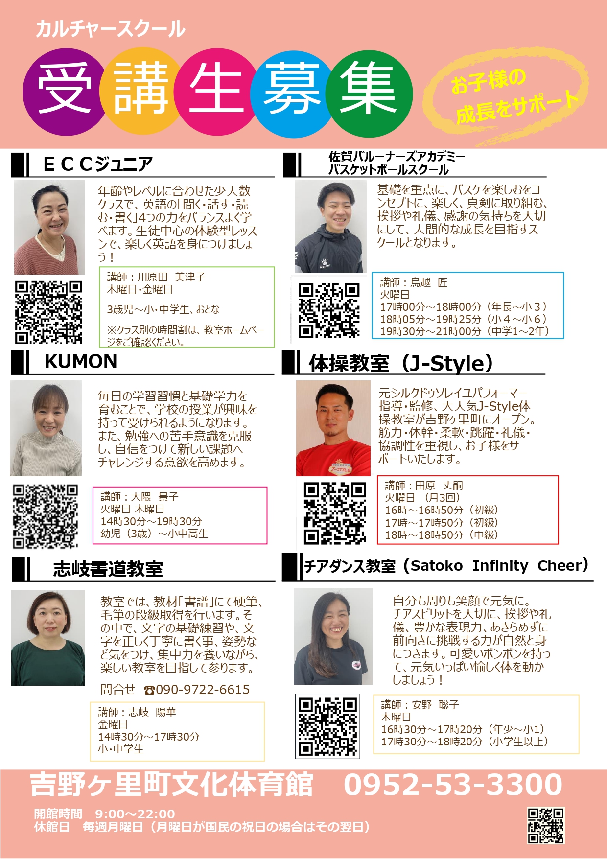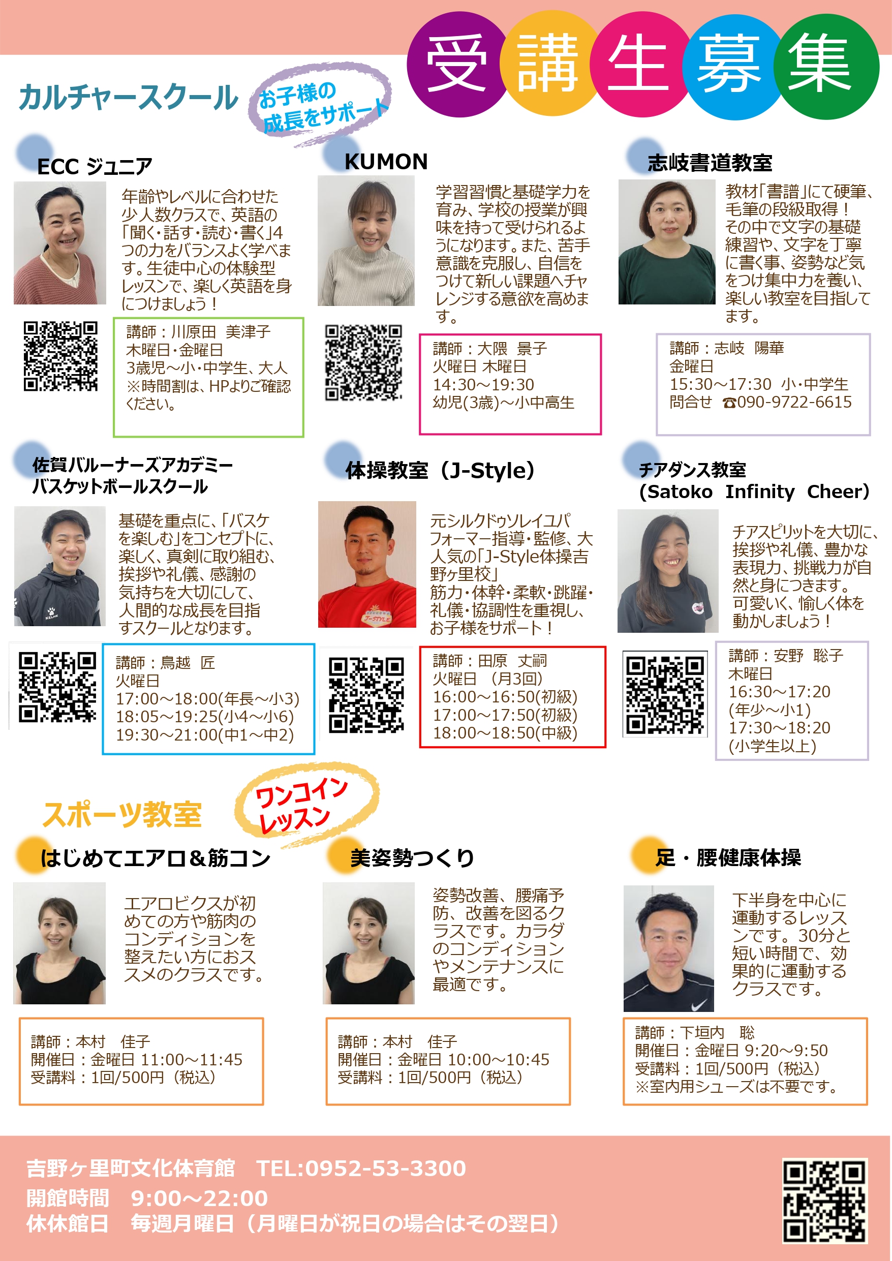 吉野ヶ里町文化体育館では、各種スポーツ教室やカルチャースクールを開催しております。