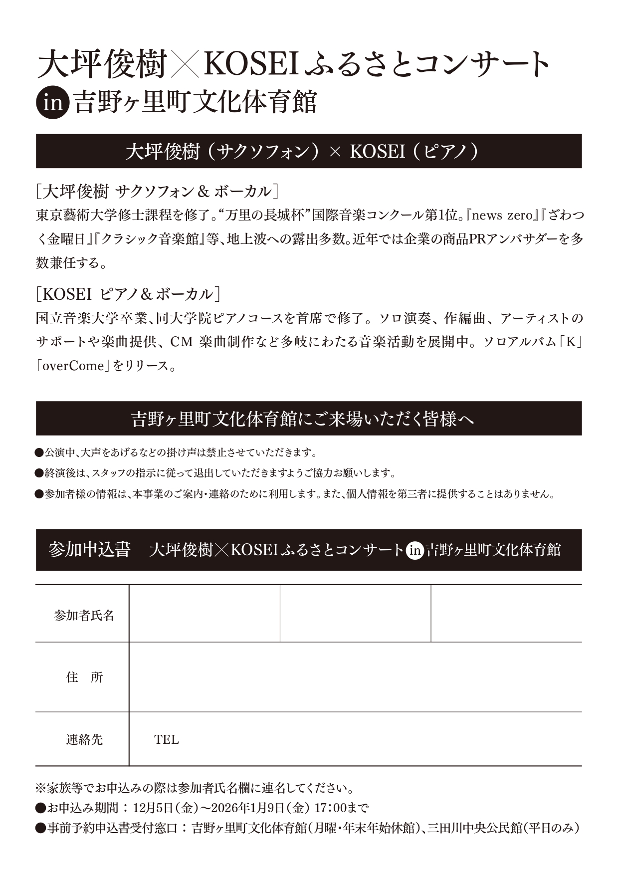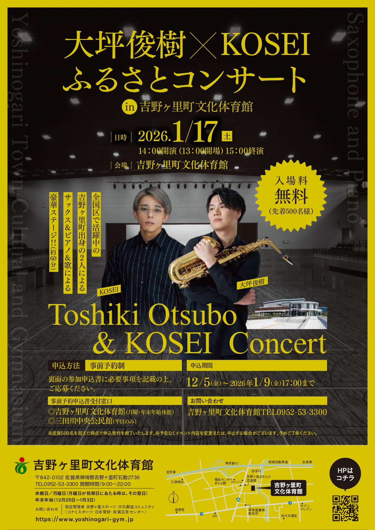 吉野ヶ里町文化体育館では1月17日(土)に、全国区で活躍中の吉野ヶ里町出身の2人によるサックス&ピアノ&歌による豪華ステージを開催します。 観覧希望の方は、チラシ裏面の申込書に記載の上、お申込みください。